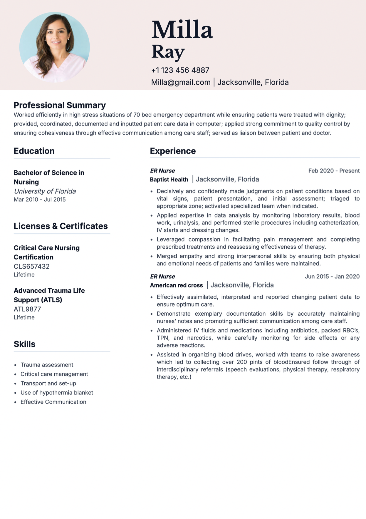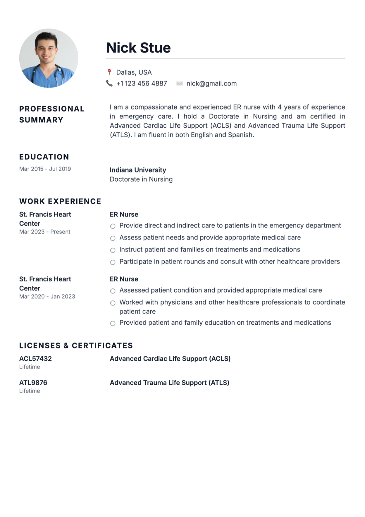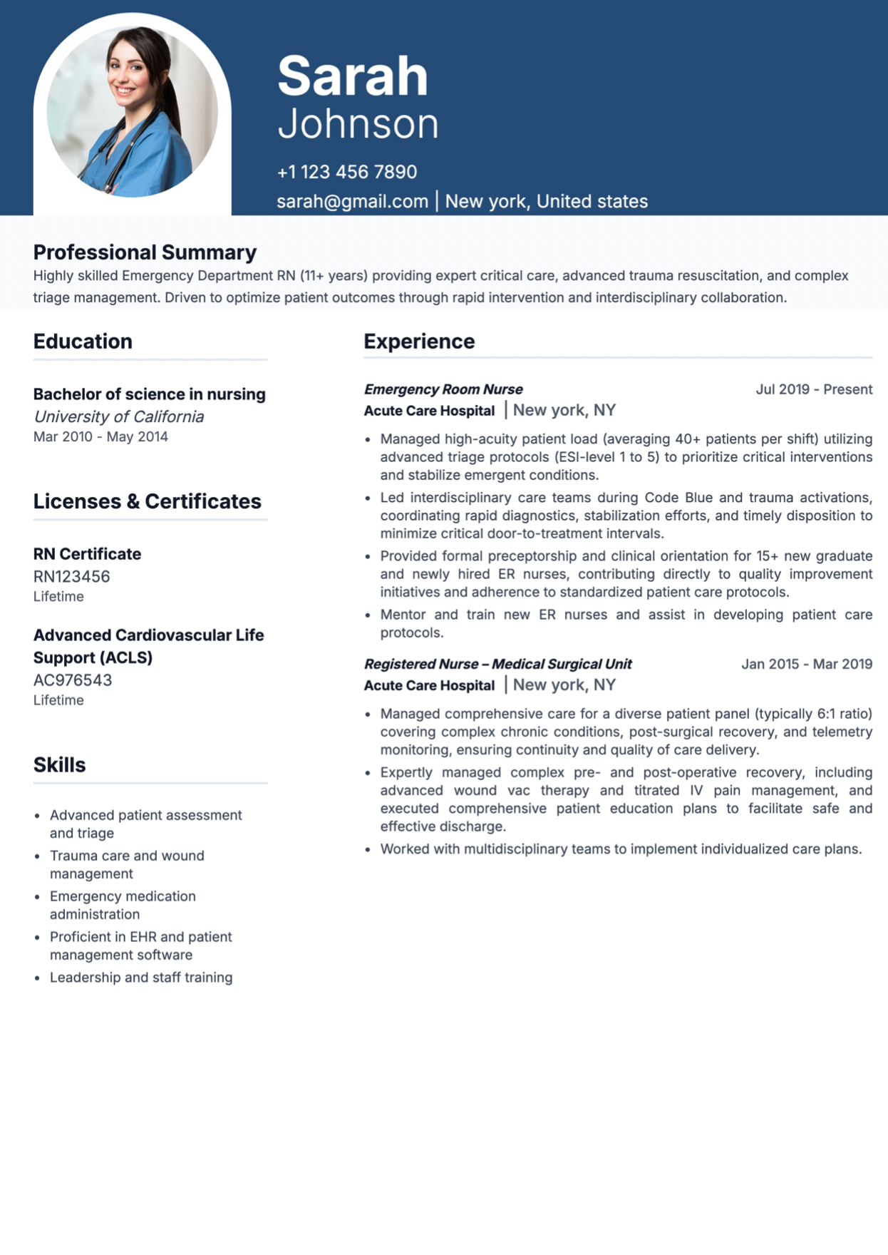 A strong ER nurse resume example highlights:
