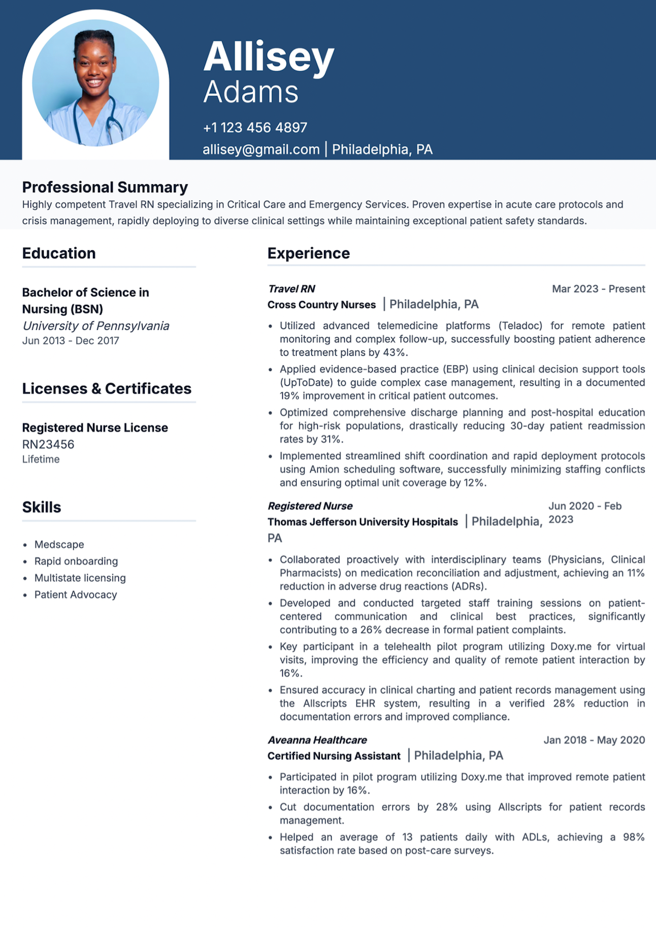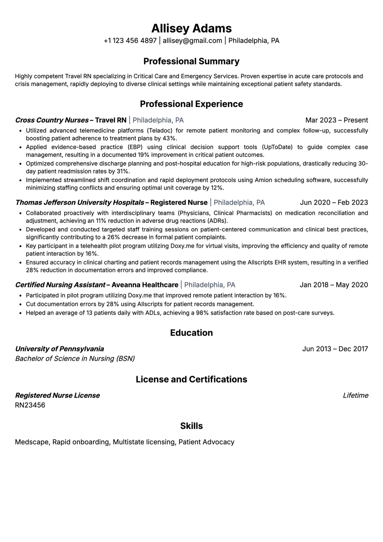 Hiring for travel nurses happens fast, and your resume must instantly show availability, clinical competence, and adaptability to work in new facilities with minimal onboarding.