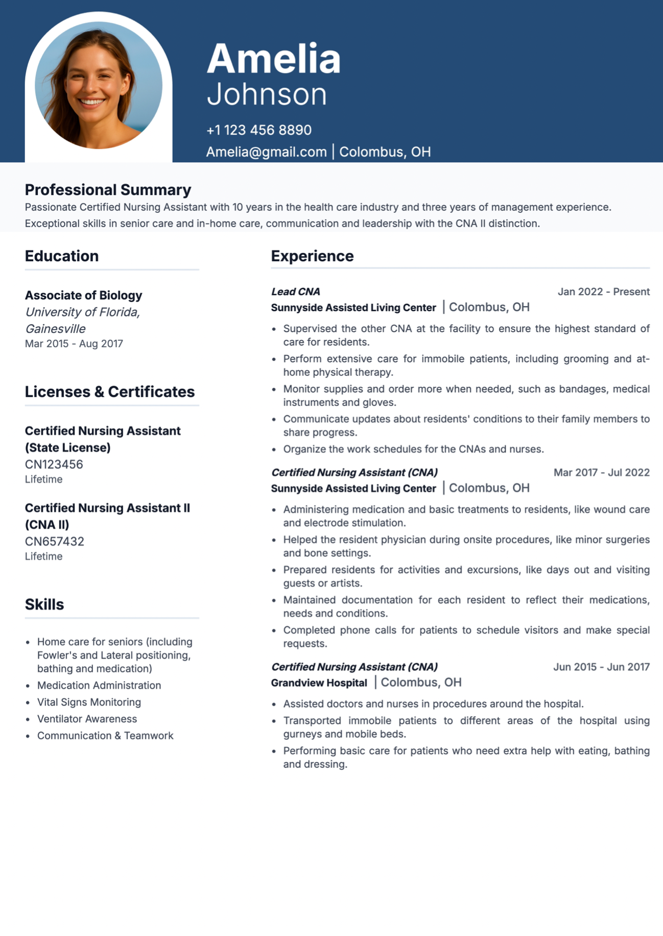 - Skills: Mention soft and hard skills relevant to CNA roles such as patient care, vital signs monitoring, infection control, etc.