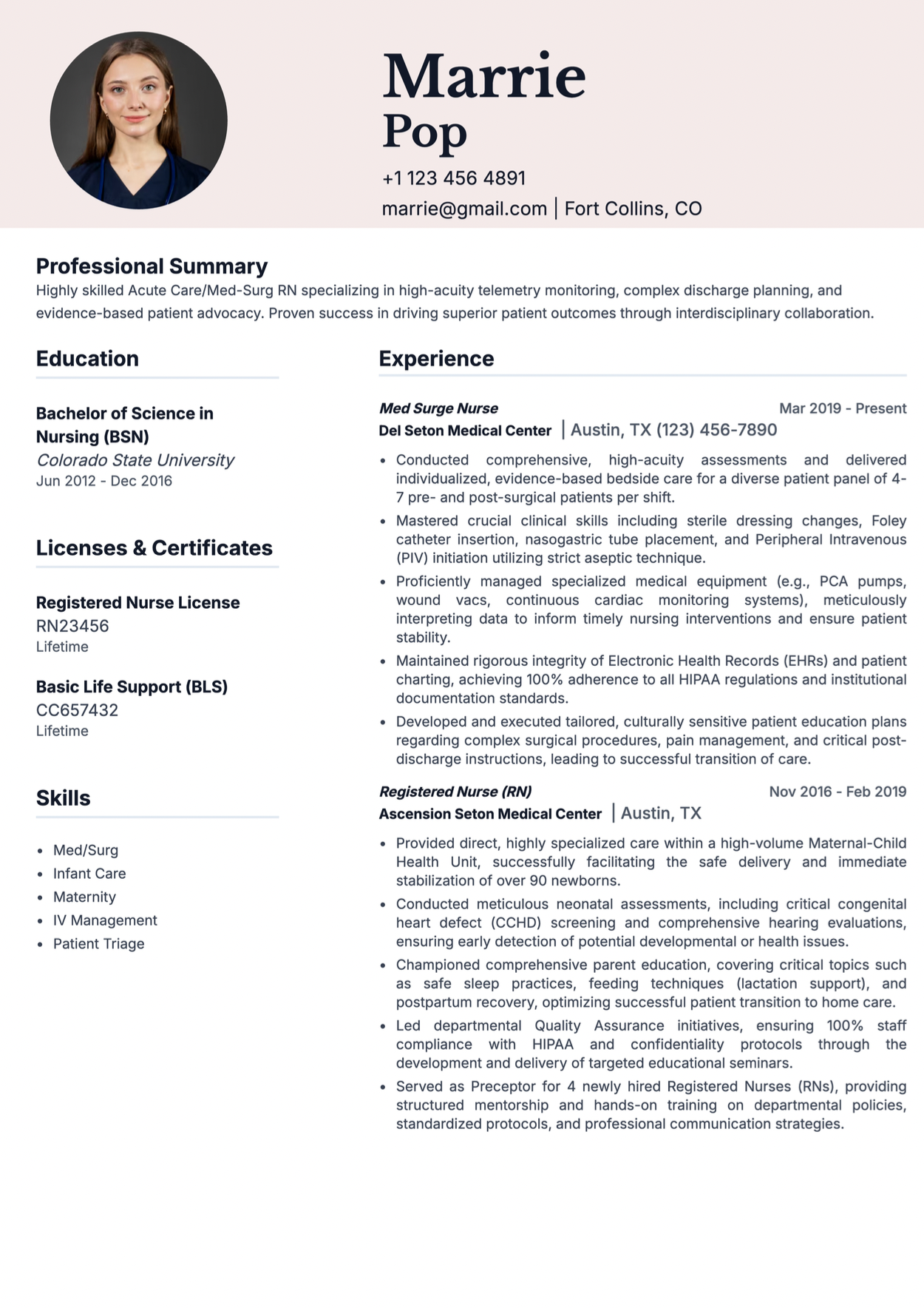 "Registered Nurse with 5+ years of acute care and med-surg experience, skilled in managing high-volume patient caseloads, reducing medication errors, and improving patient satisfaction metrics. Proven ability to work in fast-paced environments with strong clinical judgment and compassionate bedside care."