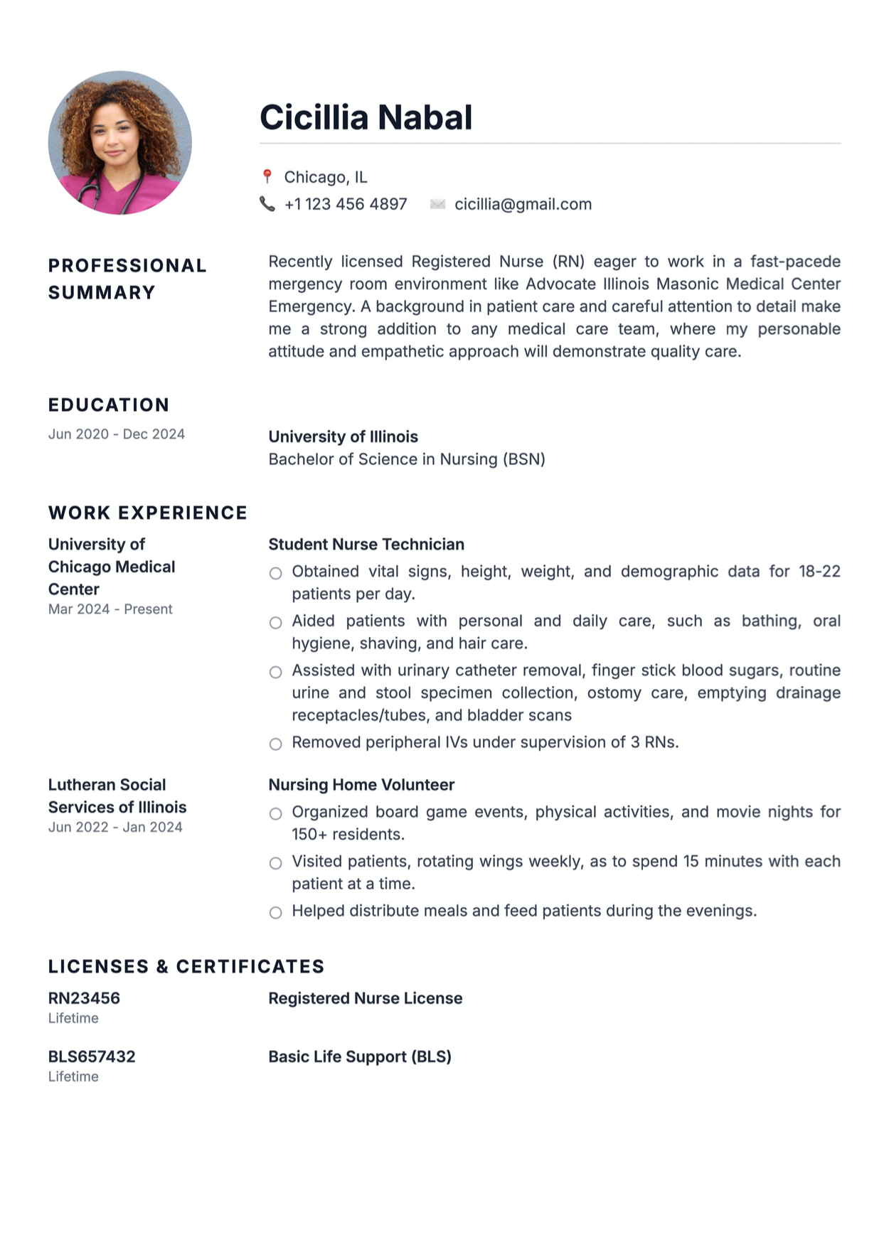 - Registered Nurse License (IL #041.123456) - Active through 2026